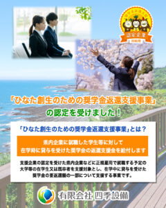 この制度は県内への人材定着を促すことを目的としており、 対象となる学生・社会人が宮崎県内の企業で一定期間働くことで、 奨学金返済額の一部または全額を県と企業が補助してくれます。 当社は宮崎県の「ひなた創生のための奨学金返還支援事業」対象企業として、 働きながら奨学金返済をしっかりバックアップします🤝